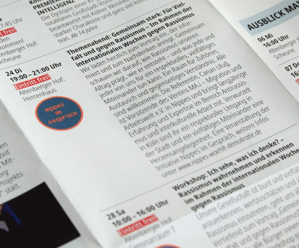Auch wir (MA.i e.V.) beteiligen uns in Köln aktiv an den Aktionswochen und laden herzlich zu folgenden Veranstaltungen der Initiative Nippes im Gespräch ein: